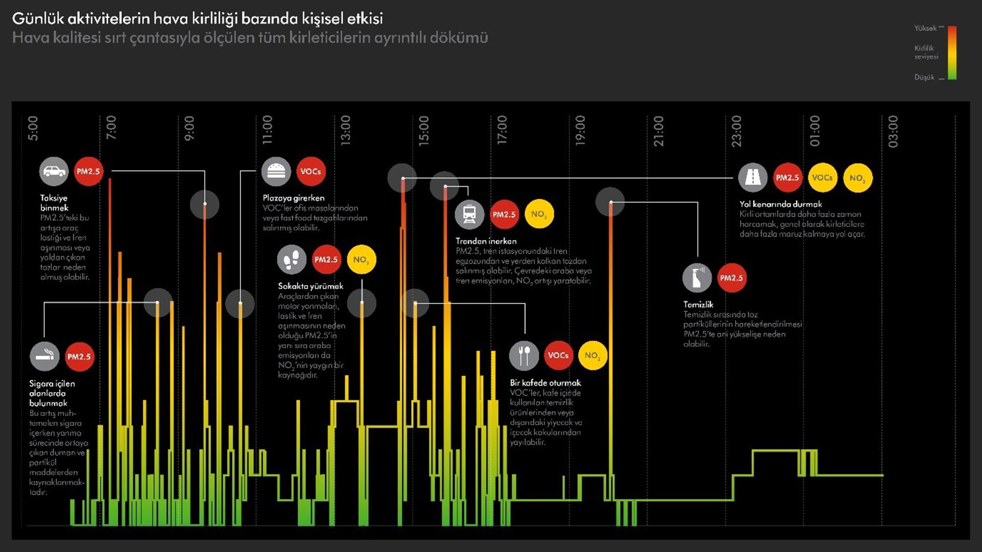 Bünyamin’in işe giderken, taksiye binerken ve tren istasyonunda beklerken PM2.5 kirliliğine de maruz kaldığı tespit edildi. PM2.5'e araba lastikleri, fren aşınması ve yoldan kalkan tozun yanı sıra; tren egzozu da neden olabilir. Bu kirletici, insanların sigara içtiği bir bölgeden geçerken, sigaranın yanma sürecinden salındığı sırada da görüldü.