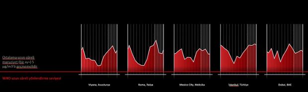 - Tüm ülkelerin aylık ortalama iç mekân PM2.5 seviyesi, yılın en az 6 ayı boyunca DSÖ (Dünya Sağlık Örgütü) maruziyet kılavuzunun uzun vadeli seviyesini aştığı tespit edildi. Ulusal ortalama veriler, Aralık ayında DSÖ kılavuzunun 5,5 katına ulaşırken; İstanbul iç hava kalitesinin, Şubat ayında DSÖ ortalamasının 5 katına ulaşıyor. Aralık, Ocak ve Mart aylarında ise neredeyse 5 katına çıkıyor.