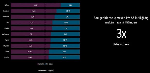 P.M2.5 değerleri incelendiğinde, çoğu ülkede iç mekân hava kirliliğinin dış mekân hava kirliliğinden daha yüksek olduğu görülüyor. Türkiye'de genel olarak iç mekân hava kirliliği dış mekân hava kirliliğinden daha düşükken, araştırma sonuçlarına göre bir metropol olan İstanbul'da tam tersi bir durum söz konusu ve iç mekân havası dış mekân havasından daha kirli. İstanbul, araştırmadaki şehirler arasında en yüksek P.M2.5 değerlerine sahip 10. şehir olarak sıralanıyor