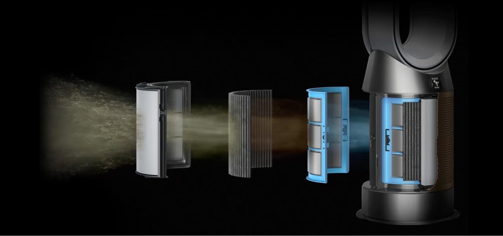 Dyson hava temizleyicileri, iki veya üç aşamada filtrelemeden önce havadaki kirleticileri tespit eden birden fazla sensöre sahiptir. Bir HEPA filtreleme sistemi toz, polen, ultra ince partiküller ve bakterileri yakalarken, aktif karbon katmanı gazları ve kokuları gideriyor. Bazı temizleyicilerimizde seçici bir katalitik oksitleme filtresi formaldehiti yakalayıp yok ediyor.²
