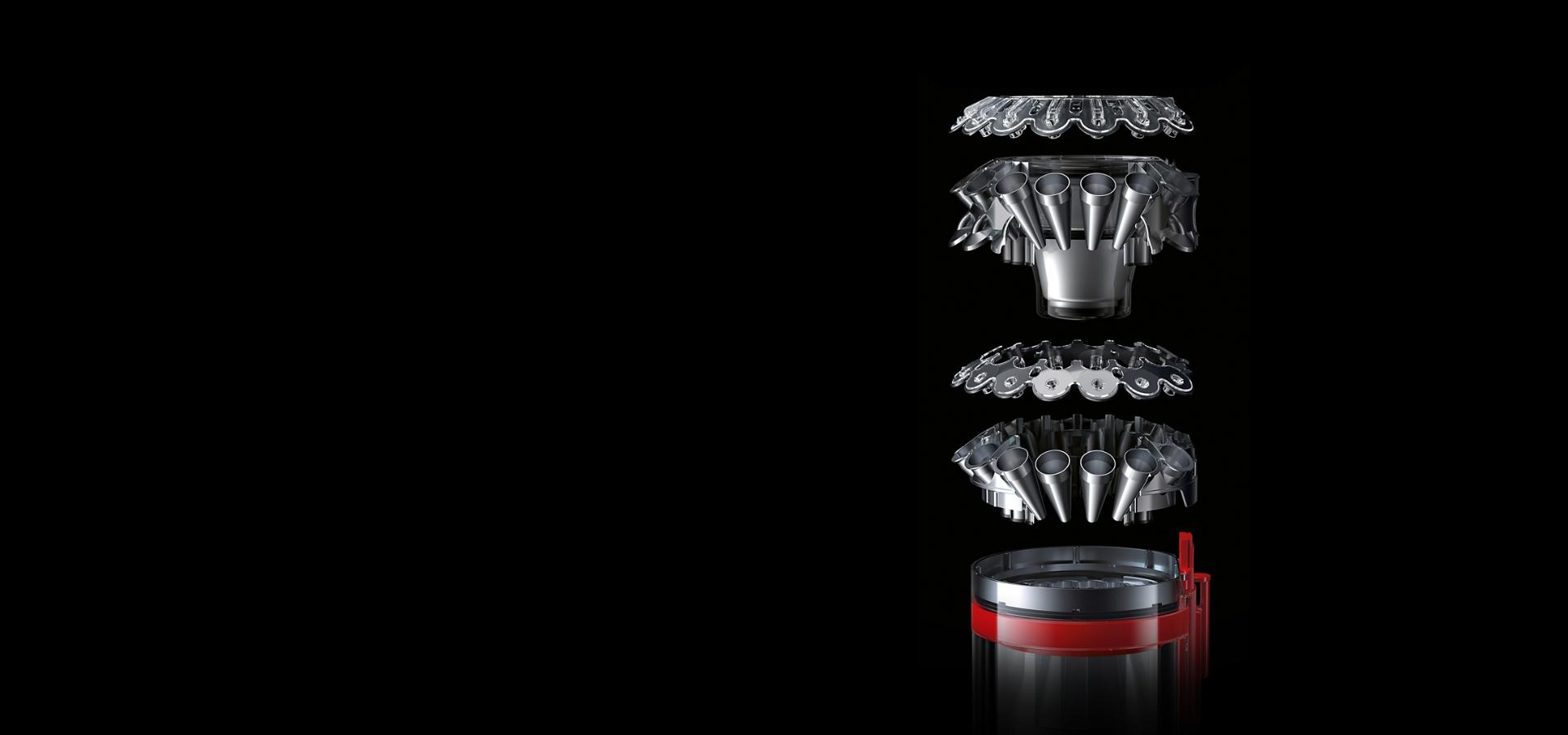 İki katman üzerine yerleştirilen 19 kompakt siklon, mikroskobik toz ve kir parçacıklarını yakalamak için güçlü merkezkaç kuvvetleri oluşturur.