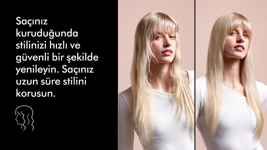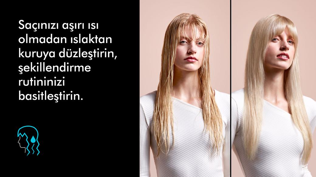 Islak saçı havayla düzleştirerek saçın parlaklığını artırın ve ısı kaynaklı hasarı azaltın. Ya da iki yıkama arasında, kuru saçta stilinizi yenileyerek saçınızın parlaklığını aşırı ısı olmadan koruyun.